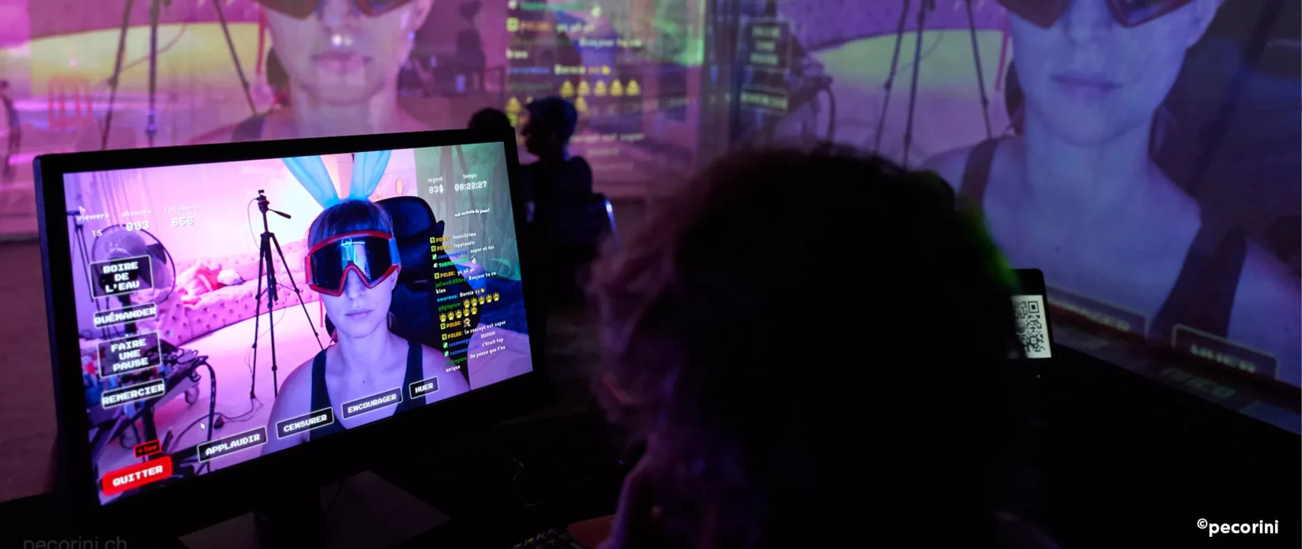 Exhibition.exe is a hybrid project combining live performance and video game, in which the audience shapes the image and destiny of a Twitch streamer in real time. Between stage and streaming, reality and virtuality, the work explores the gamification of social relationships and self-presentation in the age of platforms.