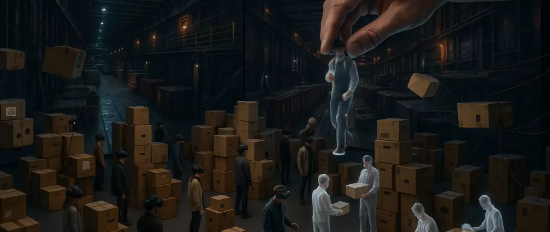 A poetic and political dive into an Amazon distribution center, like an echo of Wagner's Rhine Gold, where slaves shape the gold that will soon be stolen from them by the gods.