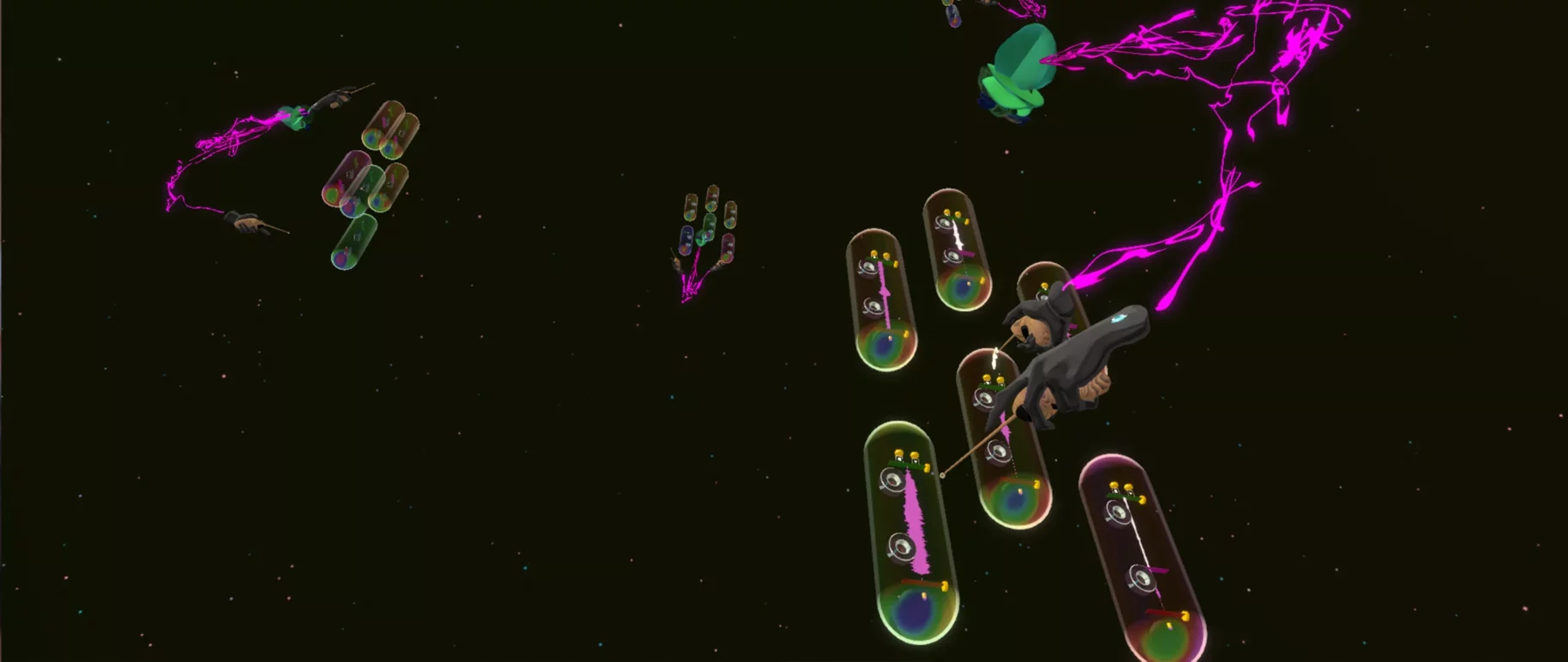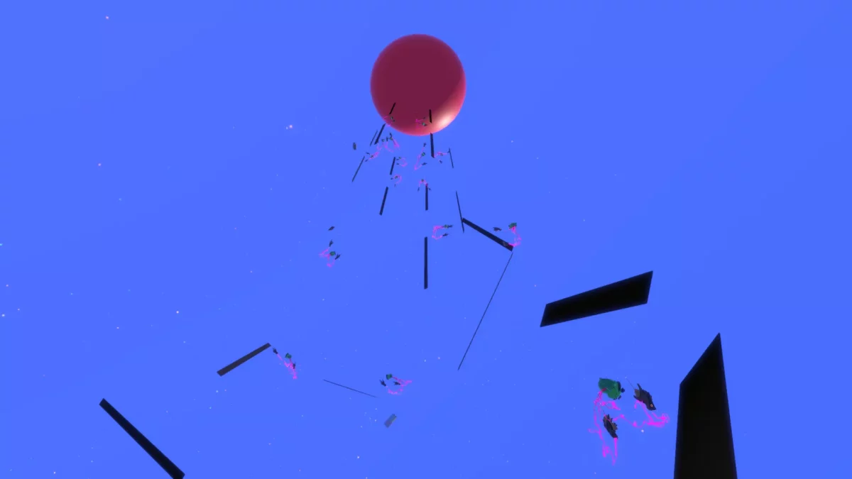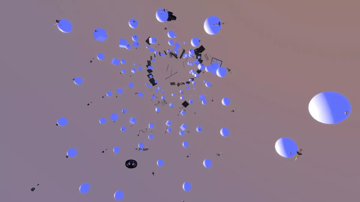 Créée dans l'environnement de synthèse sonore PatchXR, la pièce immersive proposée par Raphaël Raccuia et Nicolas Carrel invite l'auditeur·ice à un voyage ascensionnel dans un monde peuplé de « machines célibataires ».