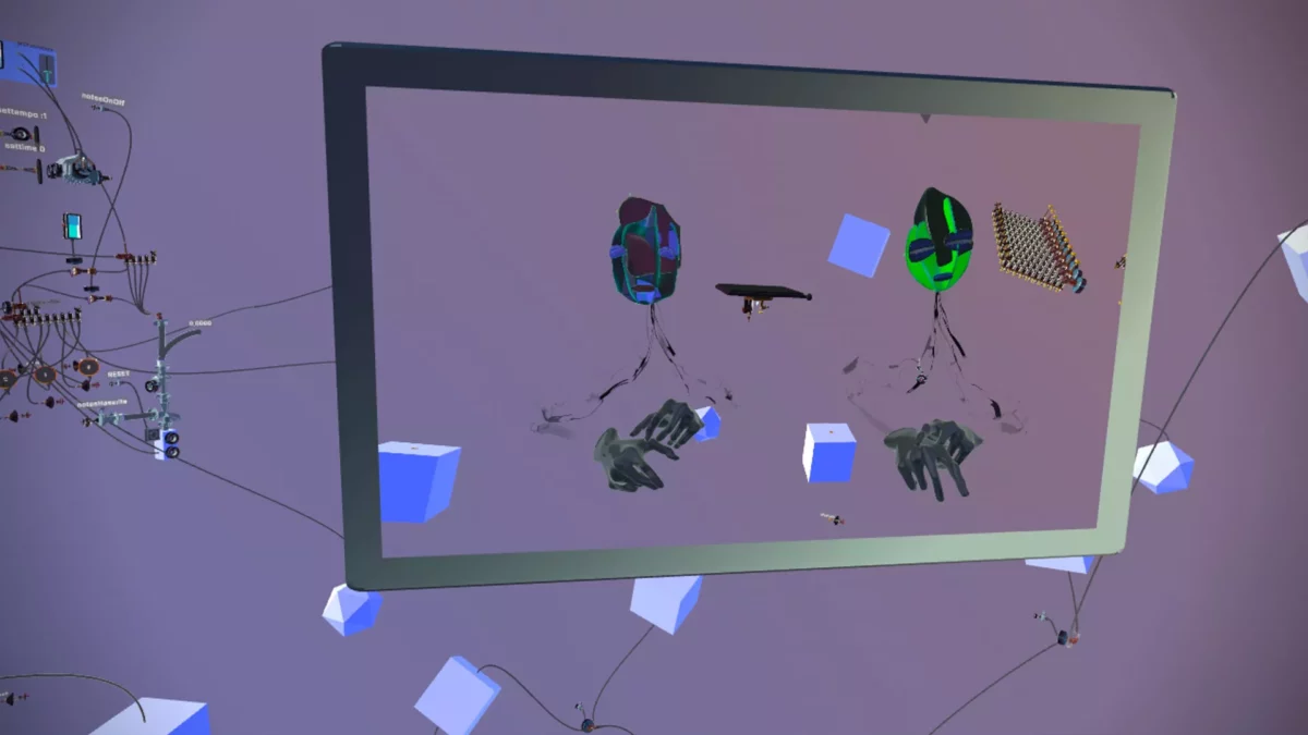 Afin de mettre en tension l'univers high-tech de la réalité virtuelle et de maintenir à distance respectable et critique les promesses de métavers, le duo use délibérément de sonorités analogiques, créant ainsi une composition à la charge émotive et intime. À chaque étage du parcours, la proposition musicale évolue, réactivée par la présence live d’un duo contrebasse/hautbois, dans un échange dynamique entre performance et environnement numérique.